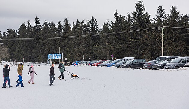Parkoviště na Šerlichu zdaleka nestačí zájmu běžkařů. (1. ledna 2025)