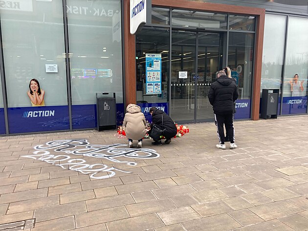 Lidé zapalují svíčky za dvě oběti před hradeckou prodejnou Action (21. 2. 2025).
