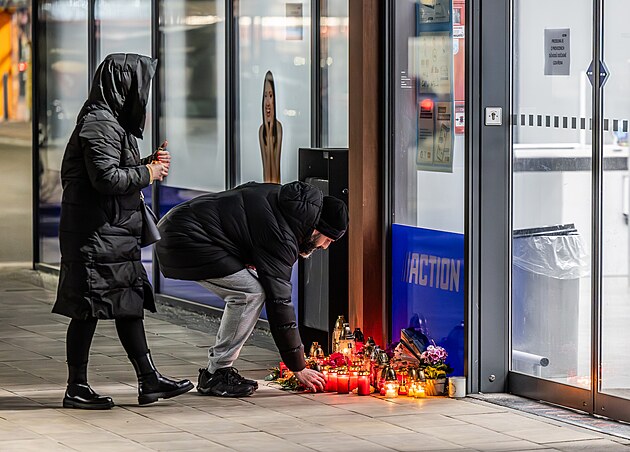 Lidé zapalují svíčky u prodejny v Hradci Králové, kde mladík ubodal dvě prodavačky (20. 2. 2025).