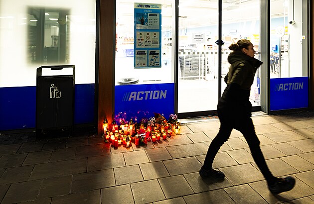 Lidé zapalují svíčky u prodejny v Hradci Králové, kde mladík ubodal dvě prodavačky (20. 2. 2025).