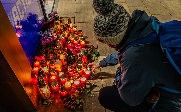 Lidé zapalují svíčky u prodejny v Hradci Králové, kde mladík ubodal dvě prodavačky (20. 2. 2025).