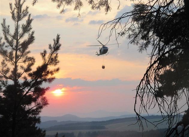 Pilot vrtulníku celkem šestnáctkrát shodil vodu na nejvíce zasažená místa, doplňoval ji na louce u Dolního Adršpachu.