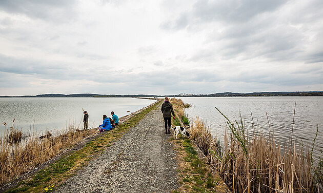 Dělící neboli Rovenská hráz nádrže Rozkoš. Vpravo je severní odkalovací část s autokempem u České Skalice, nalevo je rozlehlejší jižní část přehrady.