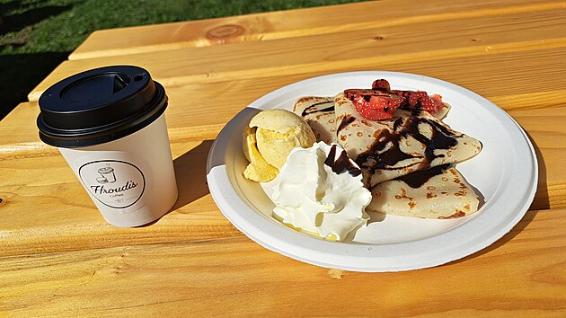 V kiosku u cyklostezky si lze objednat třeba výbornou kávu a ovocné palačinky se zmrzlinou.