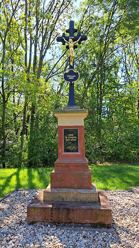 Kříž u odpočinkového místa s cedulí připomínající zaniklou obec Domkov (6. 9. 2025).