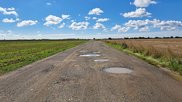 Část cyklookruhu vede polní cestou. Rozkoš je odtud vidět jen místy v dáli.