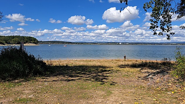 Vodní nádrž Rozkoš a v dáli Krkonoše se Sněžkou