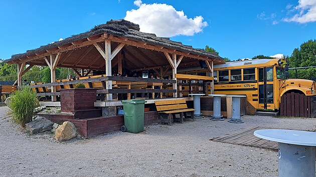 Dřevěný přístřešek s posezením u kiosku, který vznikl ze starého žlutého autobusu.