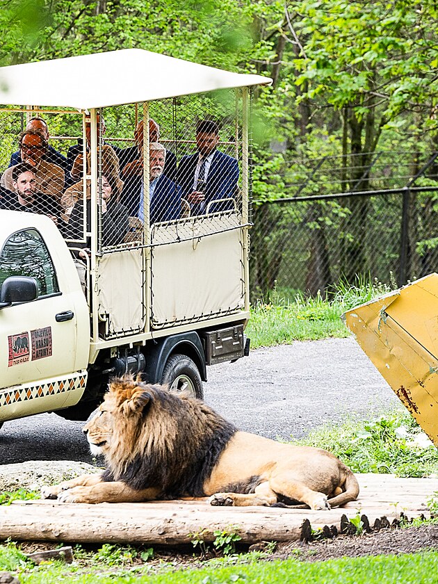 Prezident Petr Pavel s manželkou na projížďce mezi lvy v dvorském safari parku (24. dubna 2025)