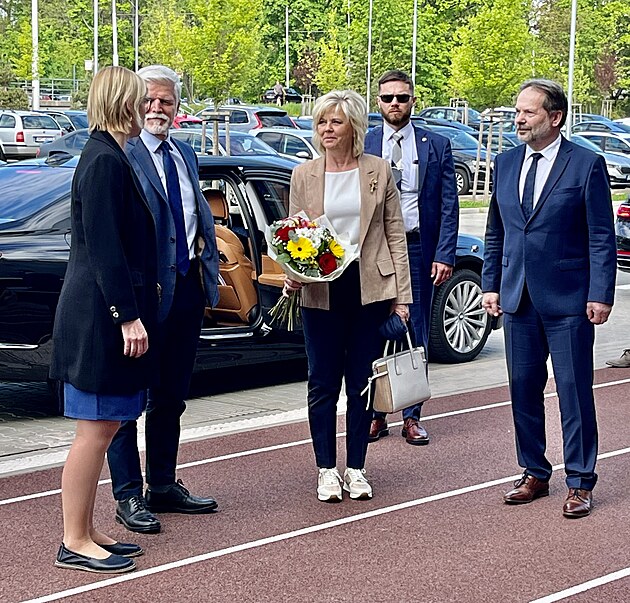 Prezident Petr Pavel zahájil návštěvu Královéhradeckého kraje setkáním s primátorkou Pavlínou Springerovou (vlevo). (23. dubna 2025)
