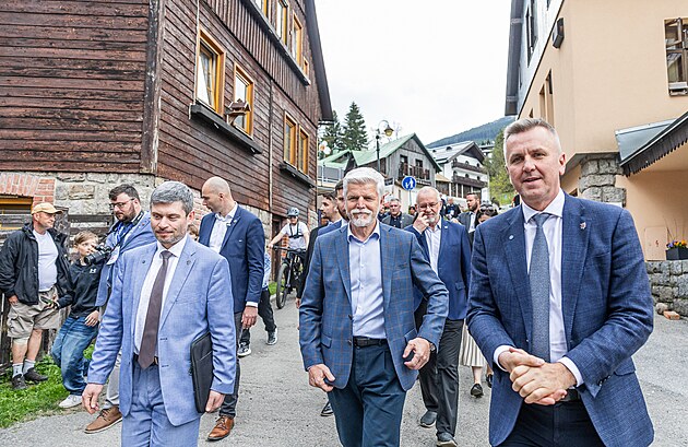 Prezident Petr Pavel a místostarosta Vladimír Staruch (vpravo) při procházce Špindlerovým Mlýnem. (23. dubna 2025)