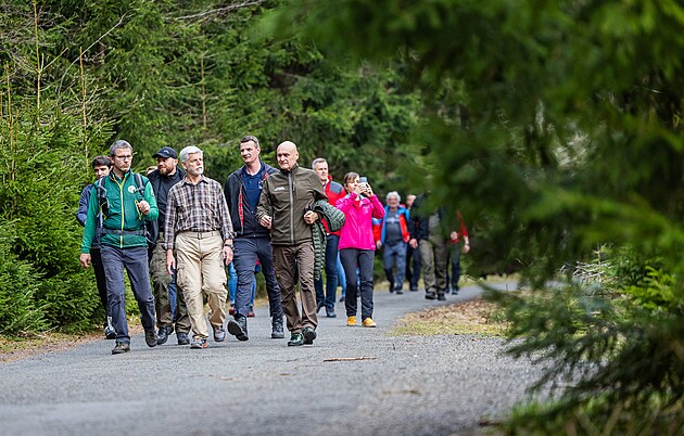 Prezident Petr Pavel na procházce z Erlebachových bud do údolí Bílého Labe u Špindlerova Mlýna. Provázeli ho ochranáři ze Správy Krkonošského národního parku a členové horské služby. (23. dubna 2025)