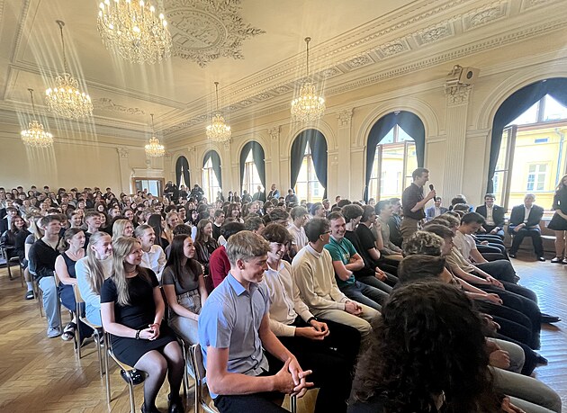 Prezident Petr Pavel mluvil se studenty královédvorského gymnázia. (24. dubna 2025)
