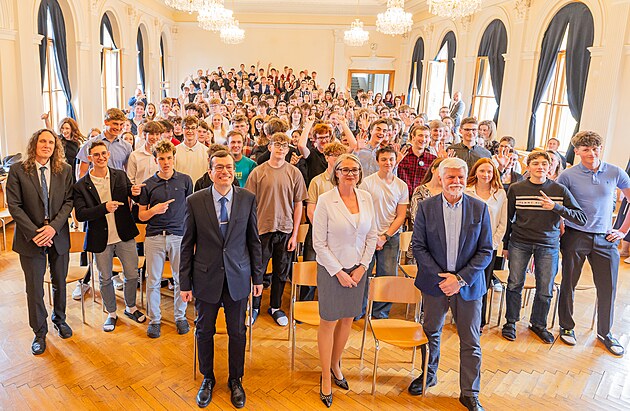 Společná fotografie po besedě prezidenta Petra Pavla na dvorském gymnáziu (24. dubna 2025)
