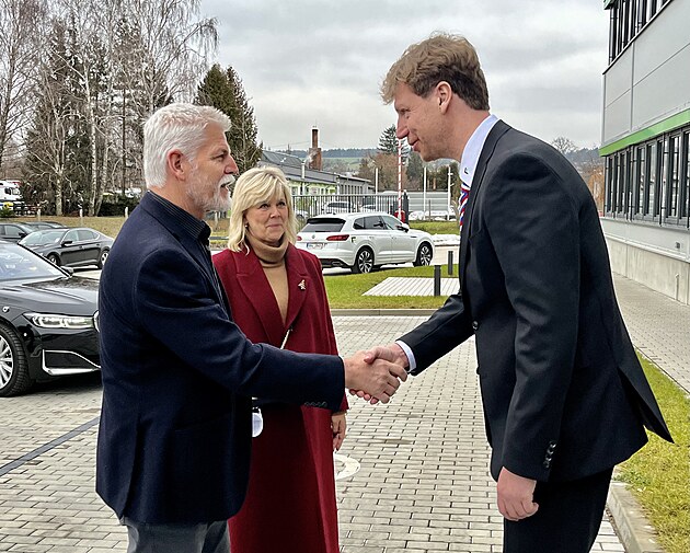 Prezidenta Petra Pavla s manželkou přivítal v Hořicích Leoš Vrbata, majitel společnosti Filipa. (11. prosince 2024)
