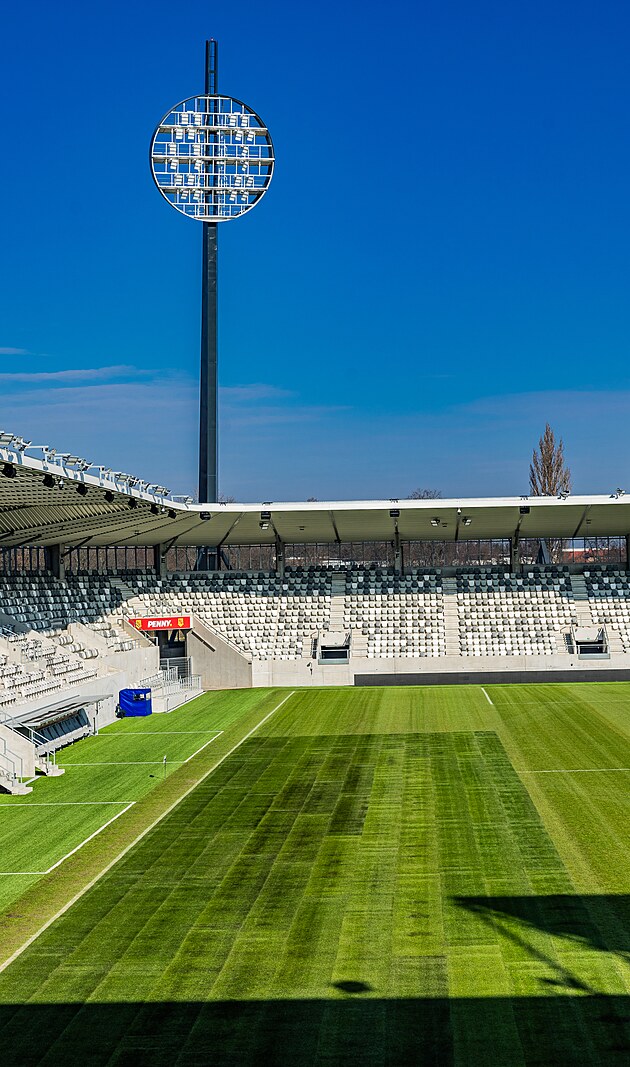 Nový trávník z Itálie položili pod jižní a západní tribunou, kde schází slunce.