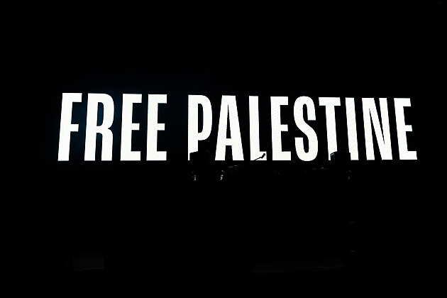 Propalestinská hesla promítala na pódiu irská rapová formace Kneecap ve svém vystoupení na Rock for People. (11. června 2025)