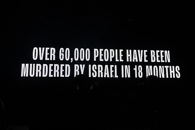 Propalestinská hesla promítala na pódiu irská rapová formace Kneecap ve svém vystoupení na Rock for People. (11. června 2025)