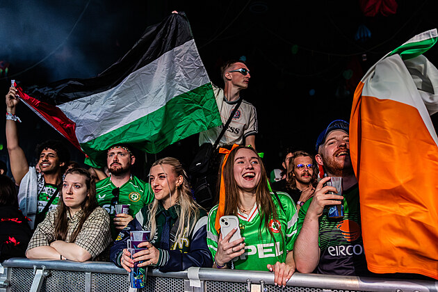 V hledišti se během vystoupení severoirské formace Kneecap na festivalu Rock for People objevila palestinská vlajka. (11. června 2025)