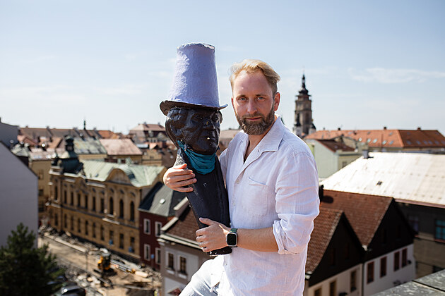 Režisér Pavel Khek s kopií Preclíkovy busty V. K. Klicpery na střeše hradeckého divadla