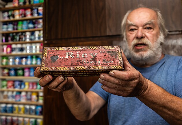 Sběratel Lubomír Kouřim ukazuje obal od žvýkaček z roku 1901.