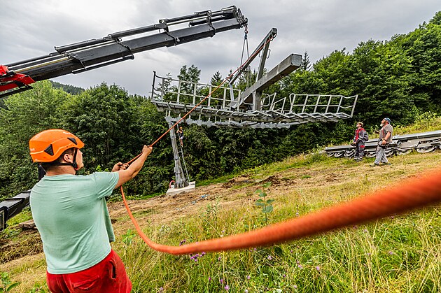 Speciální dálkově ovládaný jeřáb instaluje podpěry nové lanové dráhy v areálu Marta I v Deštném v Orlických horách.