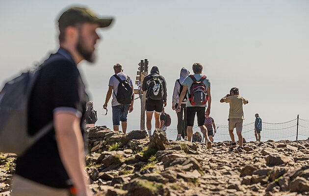 Sněžka zažila za slunného dne nápor turistů (13. srpna 2025).