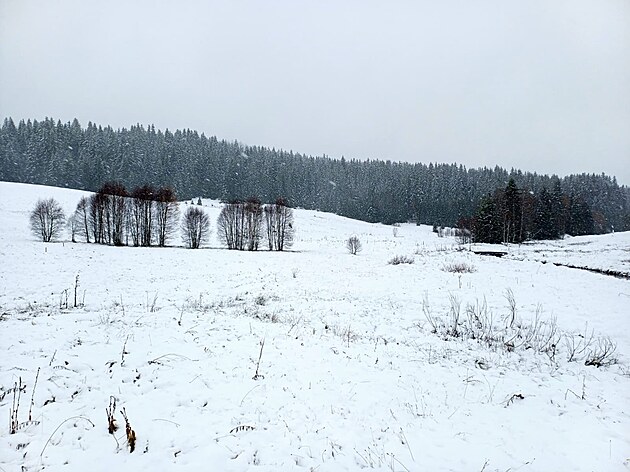 Sněžení na šumavské Kvildě. (27. října 2025)
