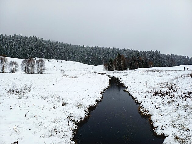 Sněžení na šumavské Kvildě. (27. října 2025)