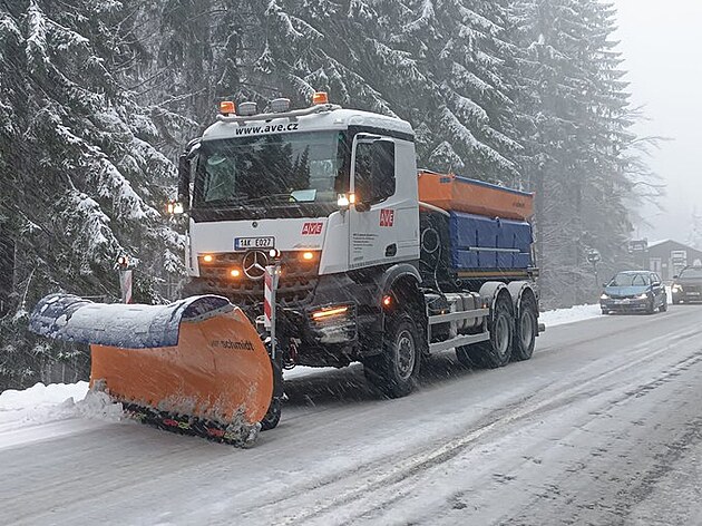 Sypač v Libereckém kraji na silnici I/10 mezi Harrachovem a polskou hranicí. (27. října 2025)