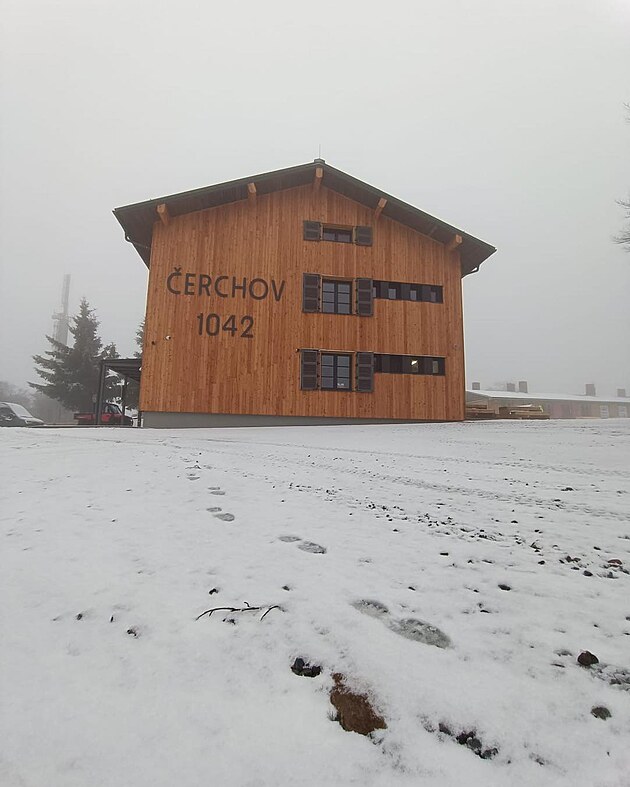 Sníh hlásí také z nedávno otevřené horské chaty Čerchov, z nejvyšší hory Českého lesa. (27. října 2025)