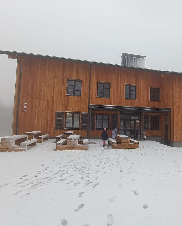Sníh hlásí také z nedávno otevřené horské chaty Čerchov, z nejvyšší hory Českého lesa. (27. října 2025)