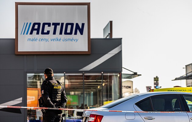 Policejní zásah v obchodní zóně v Hradci Králové, kde po útoku nožem zemřely dvě ženy. (20. února 2025)