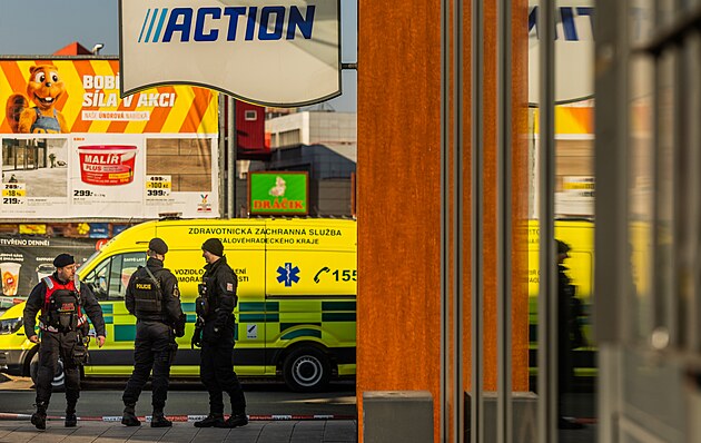 Policejní zásah v obchodní zóně v Hradci Králové, kde po útoku nožem zemřely dvě ženy. (20. února 2025)