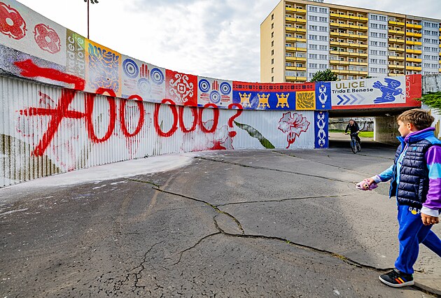 Poničené graffiti gruzínské performerky na hradecké Benešovce (29. září 2025)