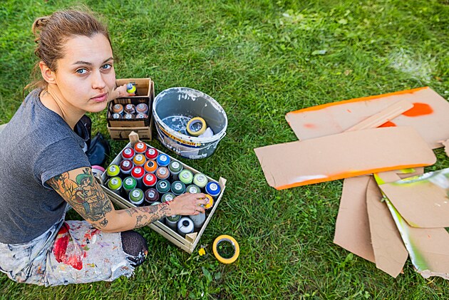 Ukrajinská umělkyně Anna Herzig-Martynenko pózuje u svého nového díla v Hradecké ulici.
