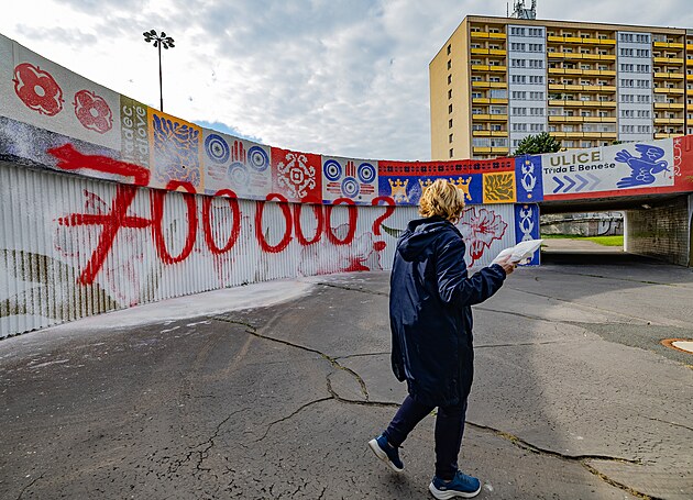 Poničené graffiti gruzínské performerky na hradecké Benešovce (29. září 2025)