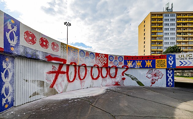 Poničené graffiti gruzínské performerky na hradecké Benešovce (29. září 2025)