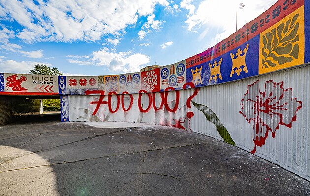 Poničené graffiti gruzínské performerky na hradecké Benešovce (29. září 2025)