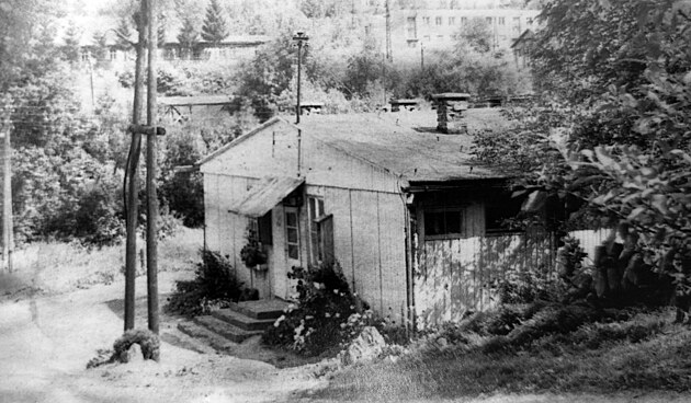 Jeden z dřevěných lágrů, kde bývala kantýna pro horníky. Vlevo vzadu stojí takzvaný zelený lágr z roku 1944 pro ruské zajatce. Až do 70. let sloužil dolům jako kanceláře.