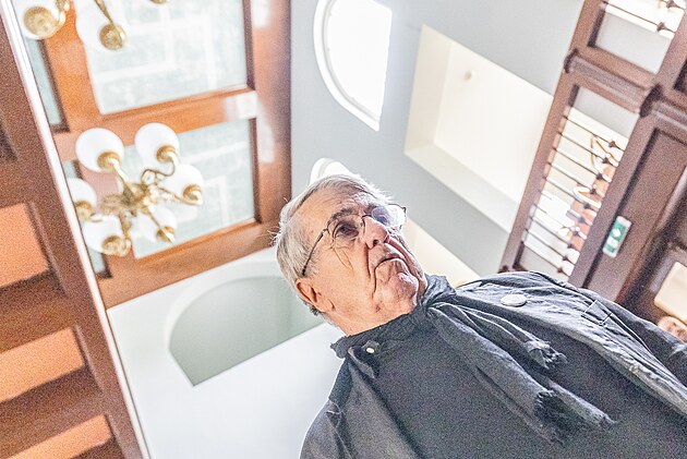 Filmový producent Jaroslav Bouček při slavnostním otevření kreativního centra v českoskalické vile Čerych, na stropě haly jsou vidět zrestaurované malby od Františka Kysely. (4. října 2025)