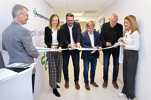 Pásku nového oddělení následné intenzivní péče stříhali (zleva) Barbora Vaculíková, generální ředitelka skupiny Penta Hospitals, ředitel vrchlabské nemocnice Michal Mrázek, starosta a senátor Jan Sobotka (Zvon, nez. za STAN) a krajský radní pro zdravotnictví Zdeněk Fink (HDK).