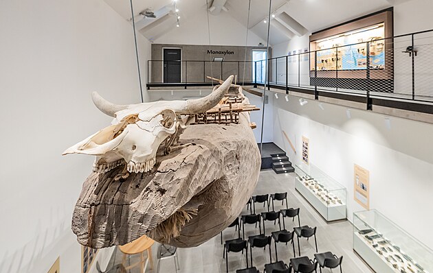 V expozici ve Všestarech visí dlabaná loď, s kterou archeologové pluli v roce 1998 a 2019 ve Středomoří při druhé a třetí expedici Monoxylon. (2. října 2025)