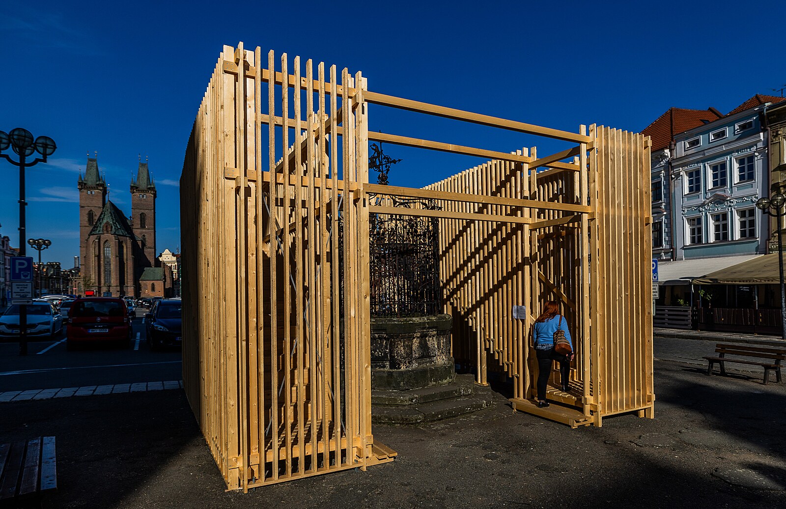 Vyhlídka Corral těsně obepíná secesní studnu na Velkém náměstí, čtyřmetrová konstrukce z prken umožňuje z vyvýšené platformy pozorovat problematické rysy náměstí, k jehož opravě vzniká projektová dokumentace, z nového úhlu.