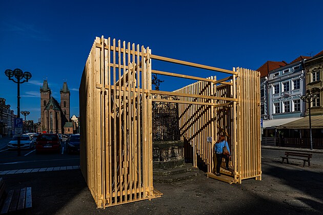 Dřevěná vyhlídka v historickém centru Hradce obklopuje secesní kašnu.