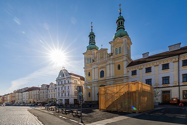 Dřevěná vyhlídka v historickém centru Hradce obklopuje secesní kašnu.
