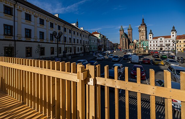 Dřevěná vyhlídka v historickém centru Hradce obklopuje secesní kašnu.