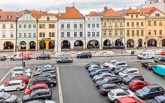 Auta parkují na hradeckém Velkém náměstí, mizí jen při výjimečných příležitostech. (18. listopadu 2024)