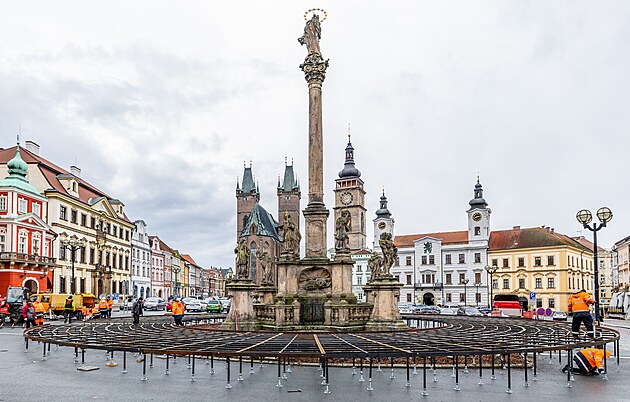 Řemeslníci stavějí kolem mariánského sloupu na hradeckém Velkém náměstí konstrukci pro kluziště. (18. listopadu 2024)