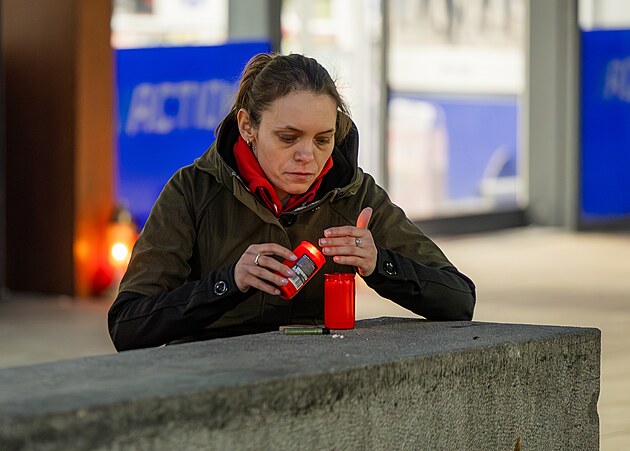 Lidé zapalují svíčky u prodejny v Hradci Králové, kde mladík ubodal dvě prodavačky (20. 2. 2025).